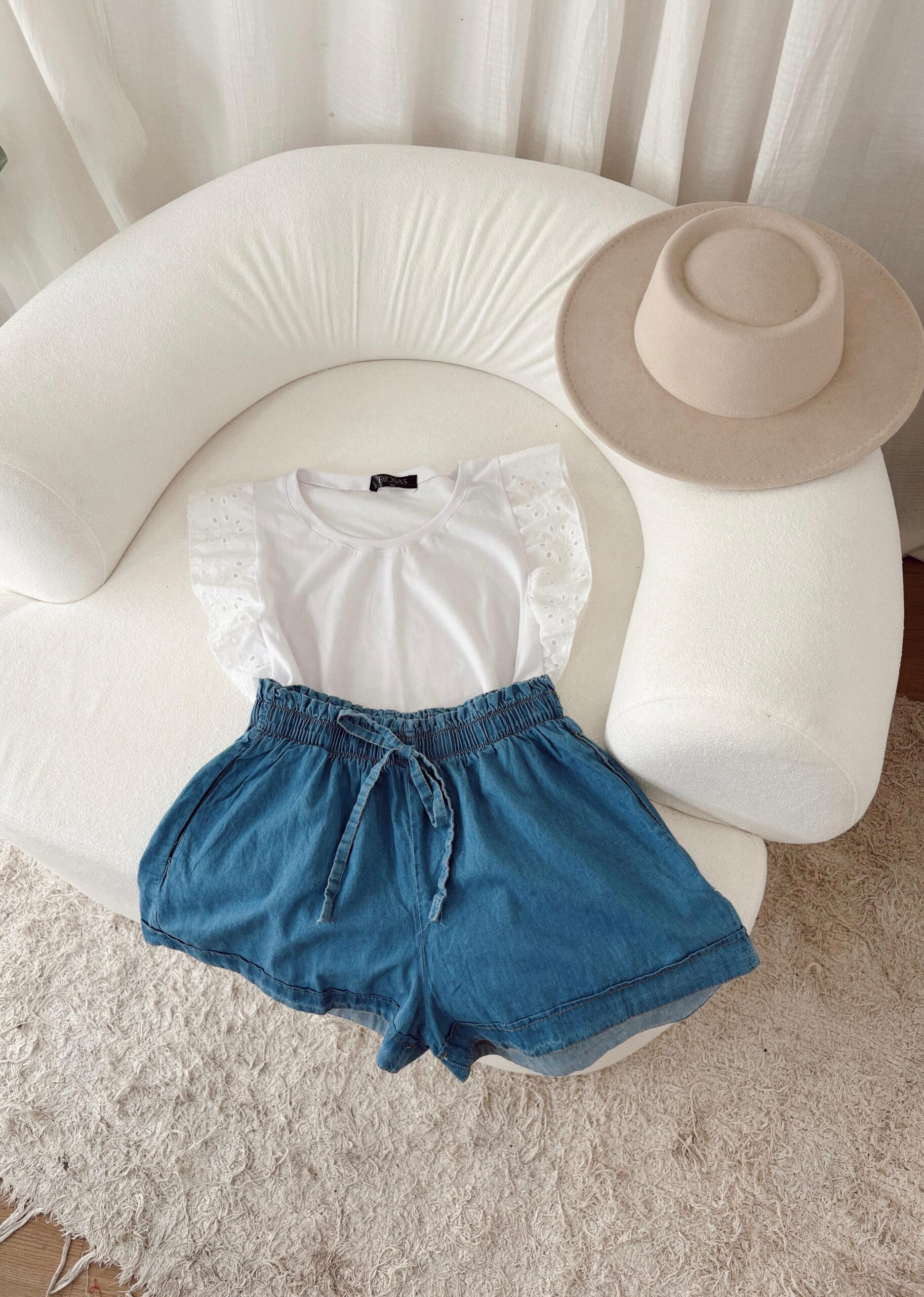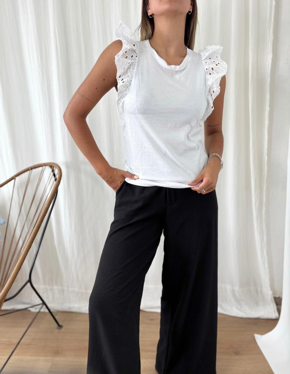 ✨Una musculosa con volados en las mangas ideal para completar tus outfits. Está confeccionada en algodón y los volados son de broderie. Fresca, cómoda y lindísima🖤.