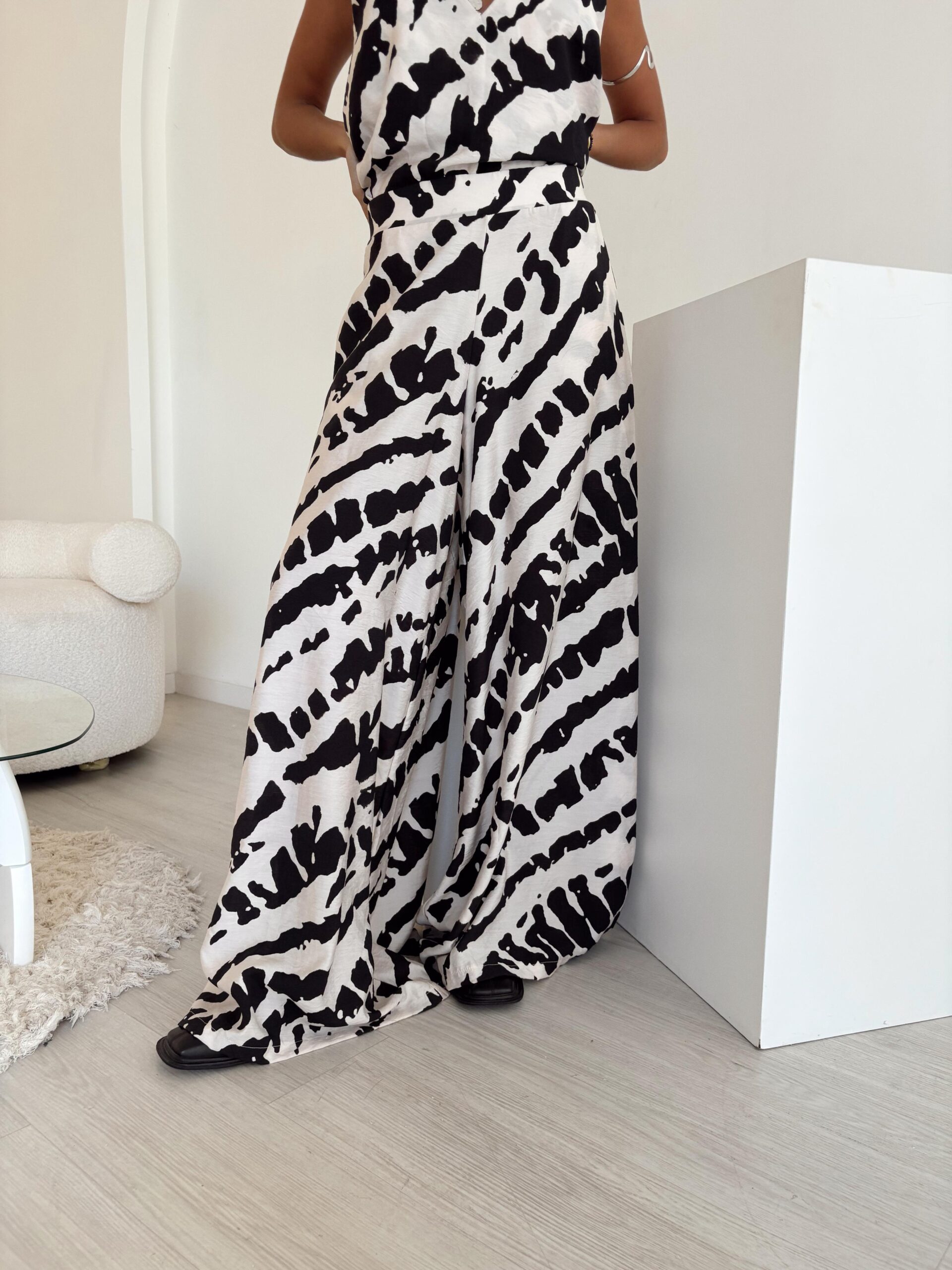 Palazo confeccionado con elástico en la parte trasera y textil seda estampada.